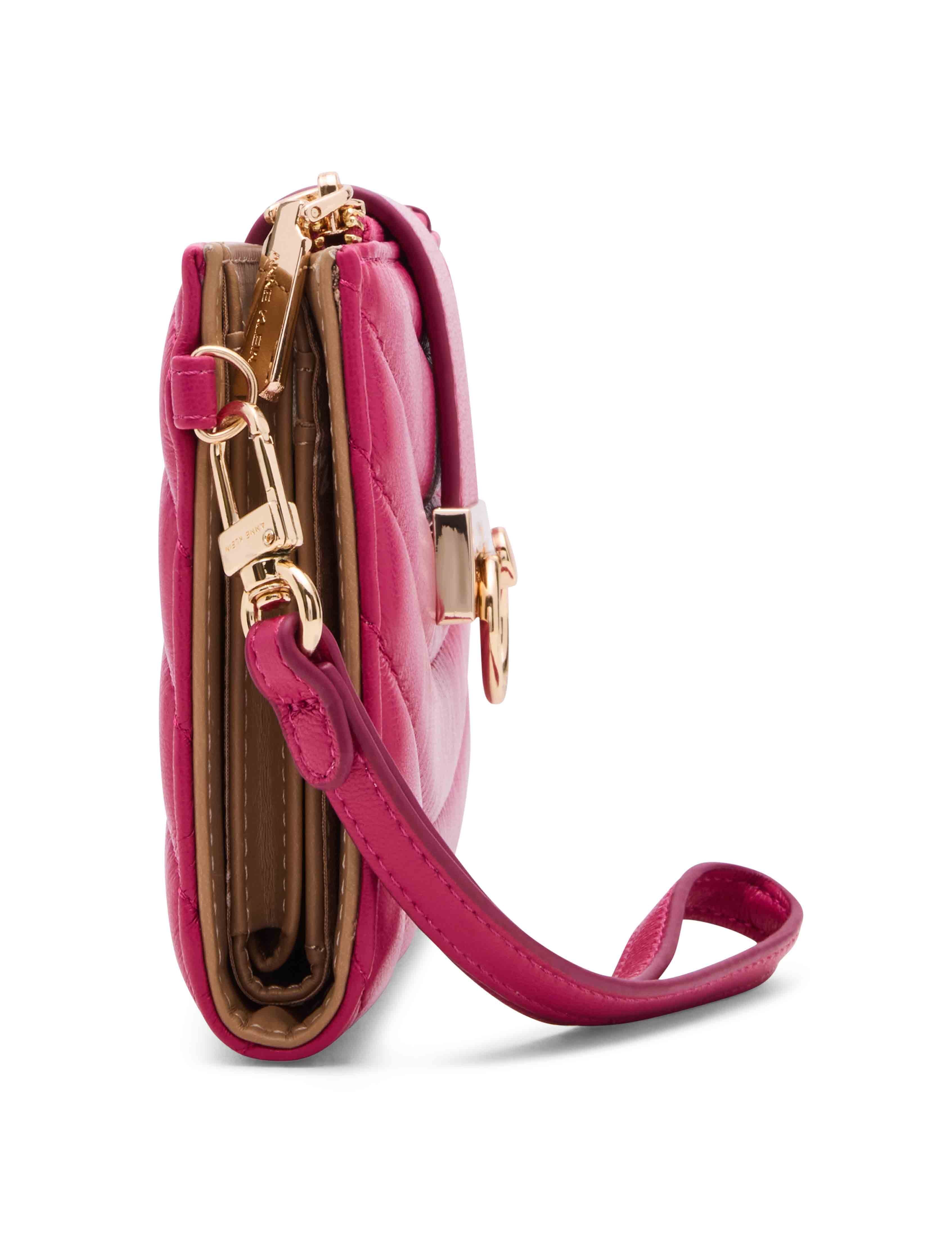 This wrist wallet is the ideal size for daily use. It features a secure flip - top closure, which when opened, shows a neatly arranged interior.