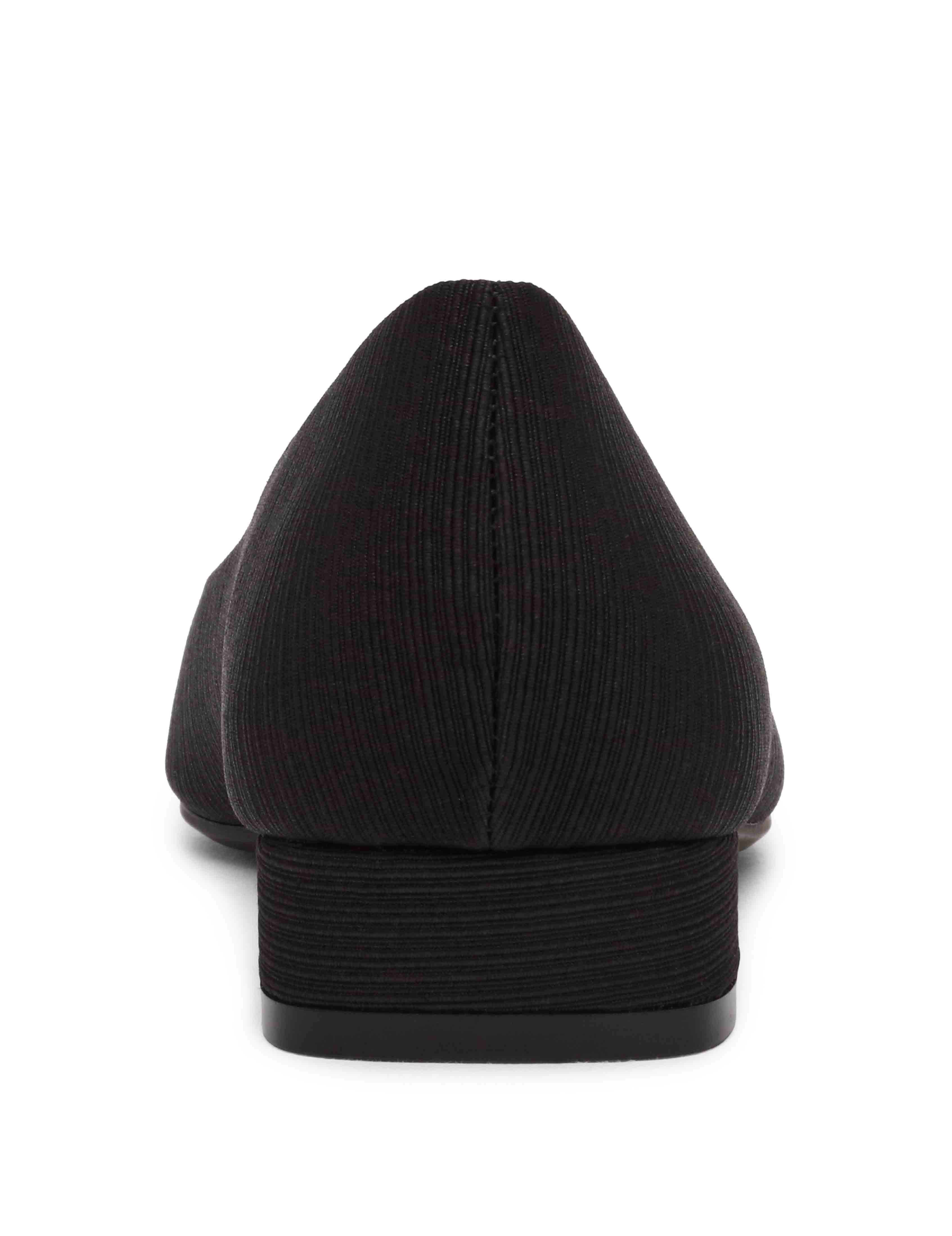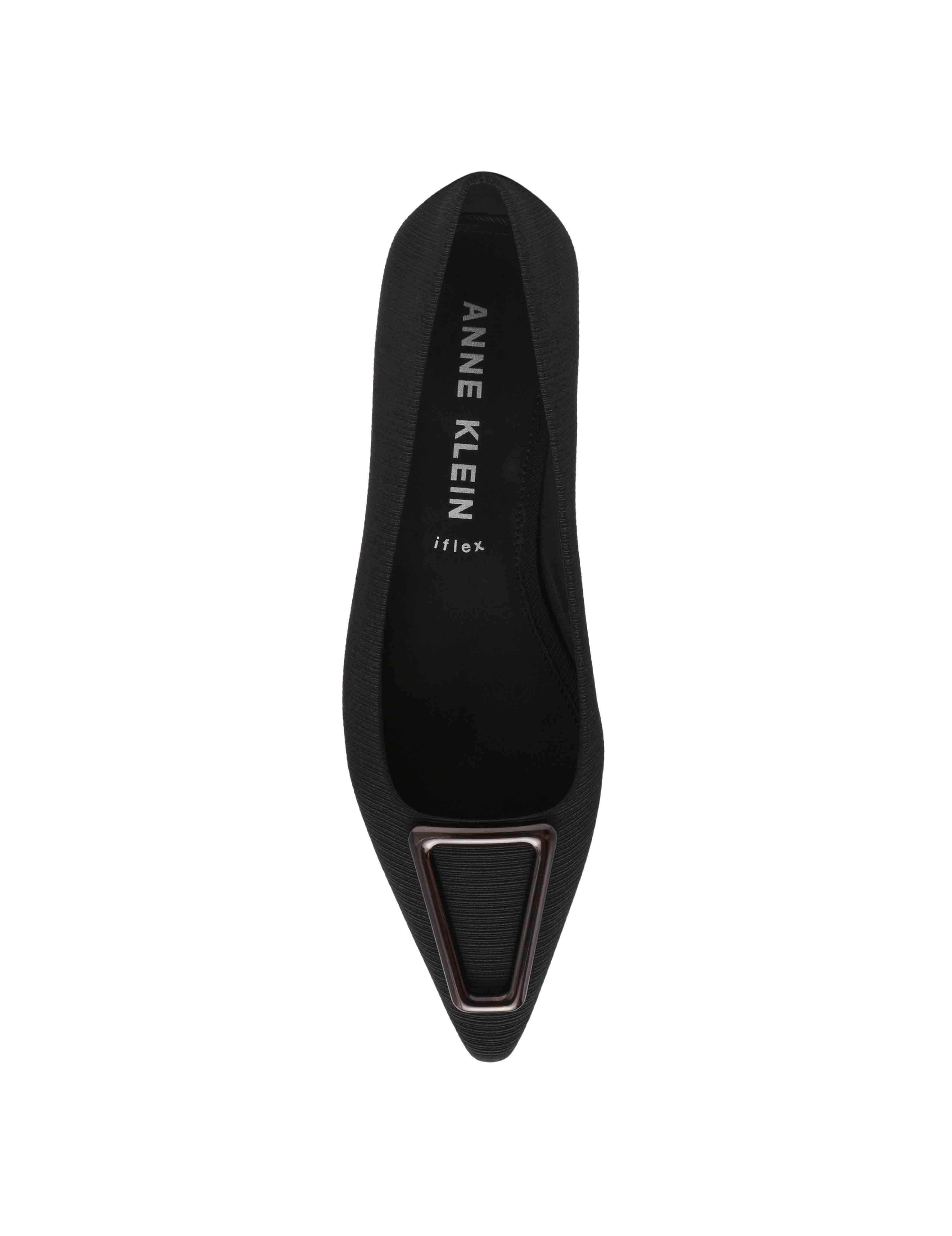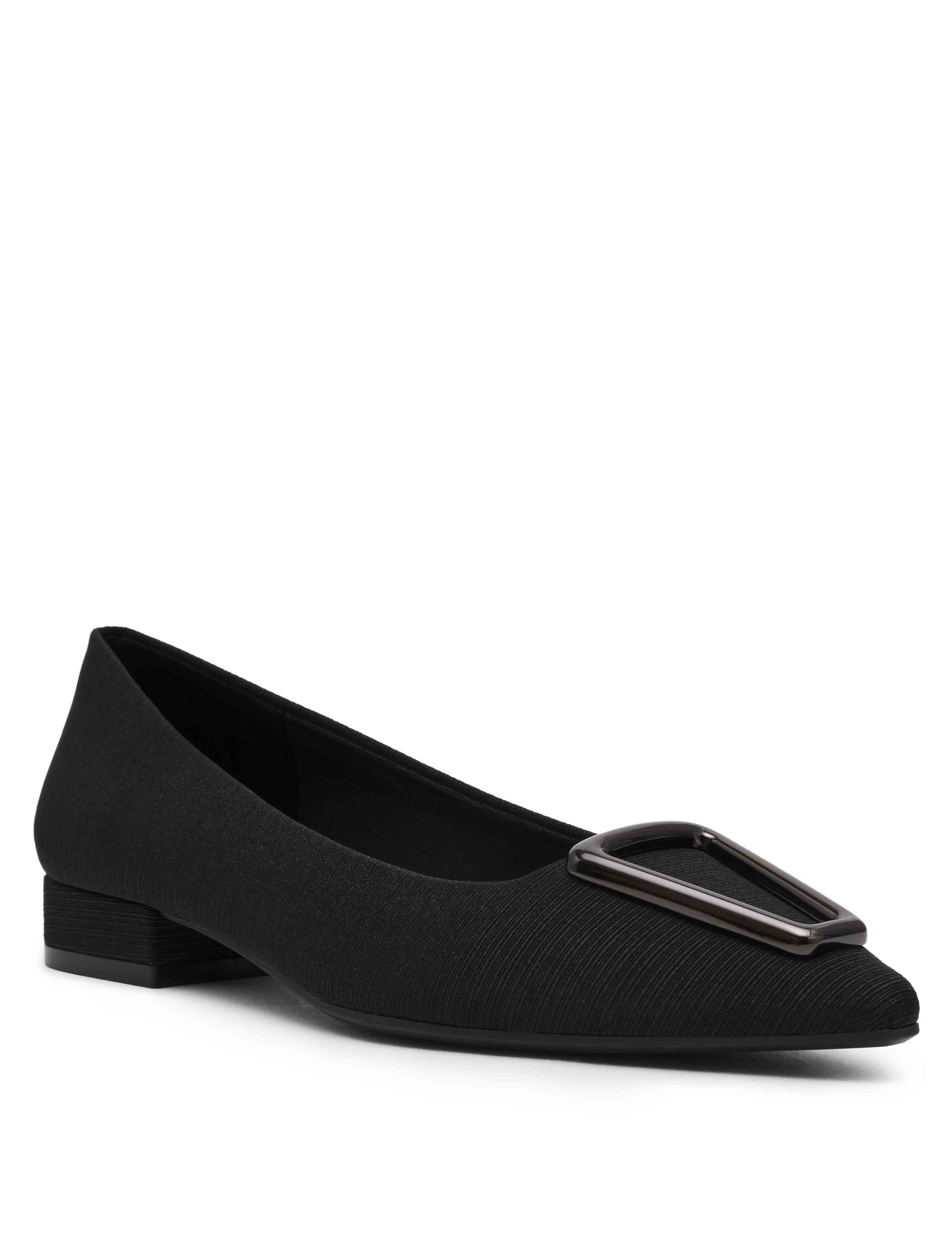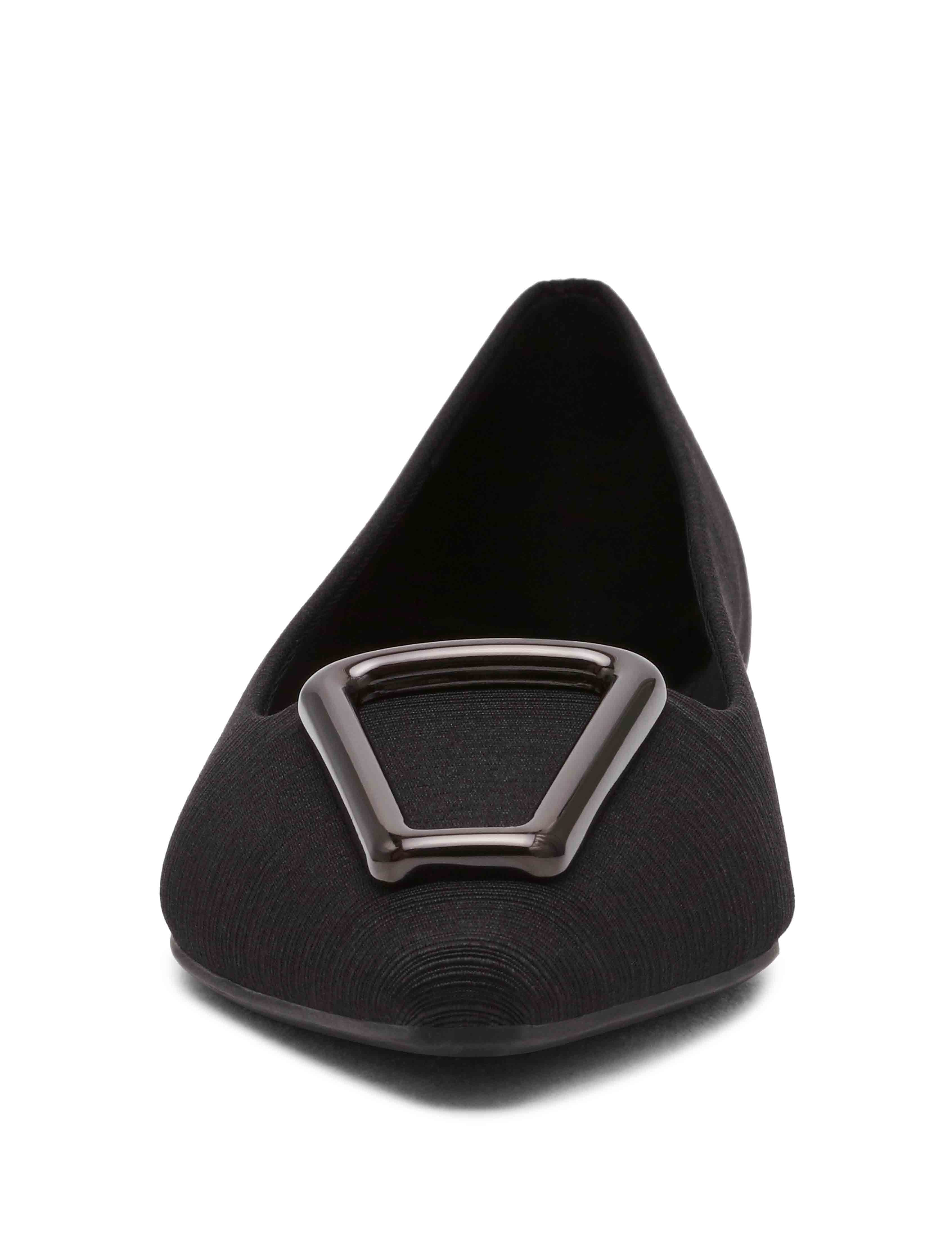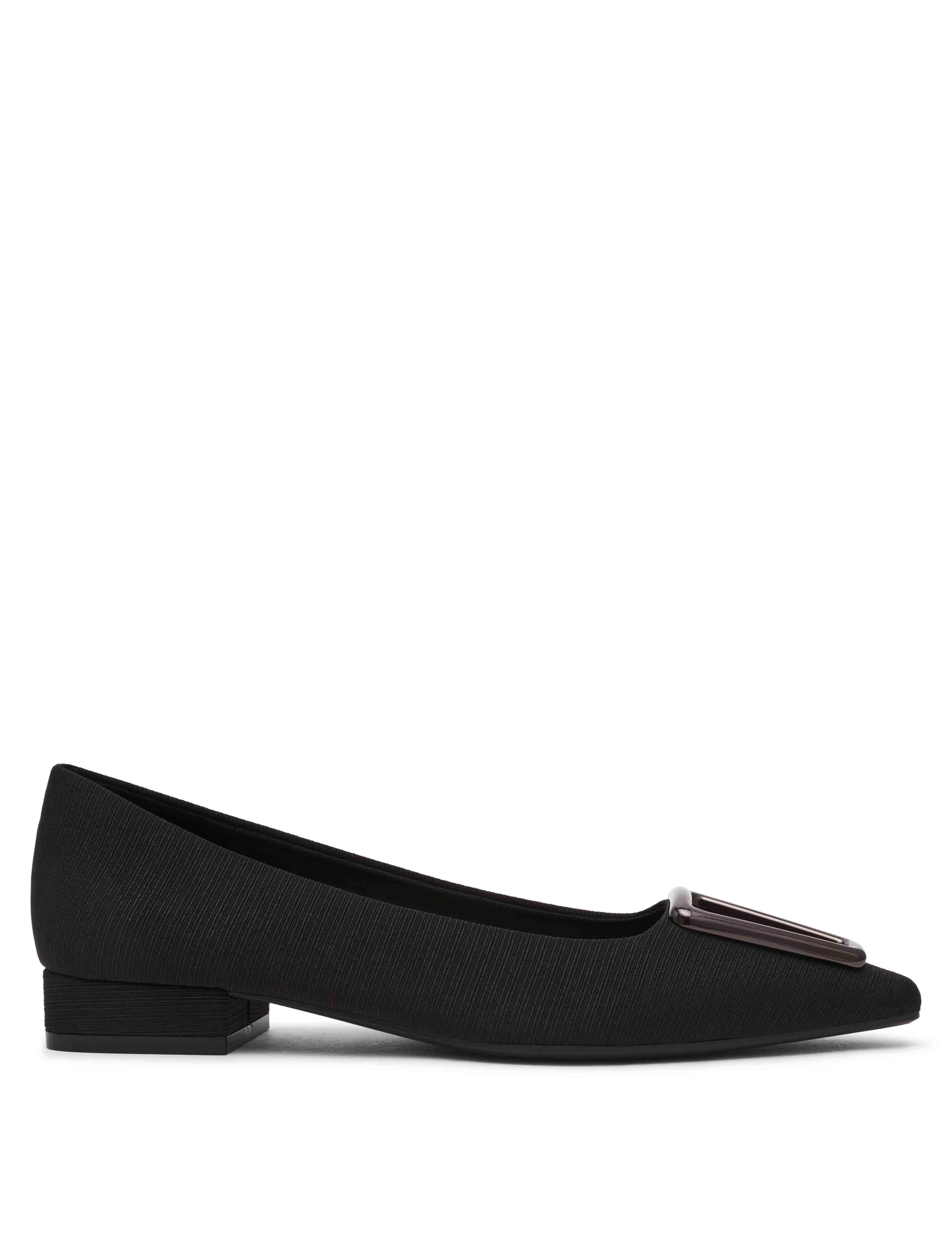 A classic flat with a modern twist. It has a smooth pointed toe, a refined short block heel, and a distinctively shaped metal decoration for a hint of contemporary charm. This flat is an ideal combination of style and adaptability.